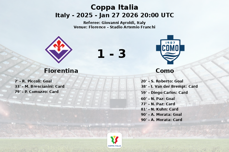 Le match a commencé avec intensité, R. Piccoli donnant l’avantage à la Fiorentina à la 7e minute, sur une passe décisive de G. Fabbian. Cependant, Como a réagi rapidement et S. Roberto a égalisé à la 20e minute, sur une passe décisive de Diego Carlos. En seconde période, N. Paz a donné l’avantage à Como à la 60e minute. Le match semblait se diriger vers une victoire étroite, mais A. Morata a scellé la victoire à la 90e minute, après une passe décisive de N. Kuhn.