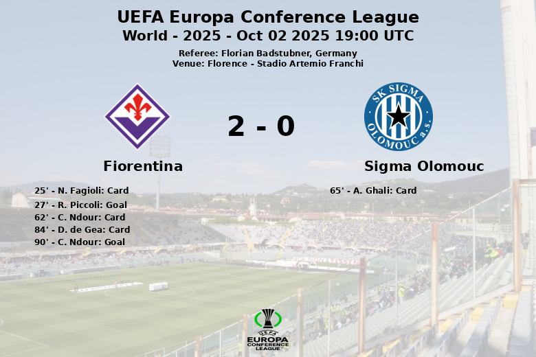 Le match a été interrompu par plusieurs avertissements, avec trois cartons jaunes pour les joueurs de la Fiorentina et un pour le Sigma Olomouc. Dans le temps additionnel, C. Ndour a scellé la victoire de la Fiorentina avec un but à la 90e minute, sans passe décisive, assurant les trois points à domicile. Le match s’est terminé sur le score de 2-0 en faveur de l’équipe locale.