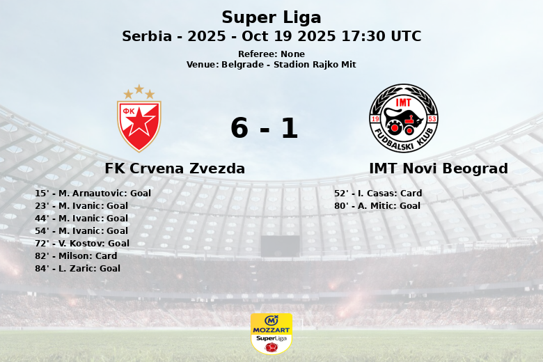 La domination de Crvena Zvezda s’est reflétée dans les statistiques : 64 % de possession, 15 tirs (9 cadrés), 5 corners et 15 fautes. L’IMT Novi Beograd, quant à lui, a eu 36 % de possession, 10 tirs (3 cadrés), 6 corners et 10 fautes. Le match s’est déroulé lors de la 12e journée de la saison régulière de la Super Liga serbe. Les deux équipes ont reçu un carton jaune.
