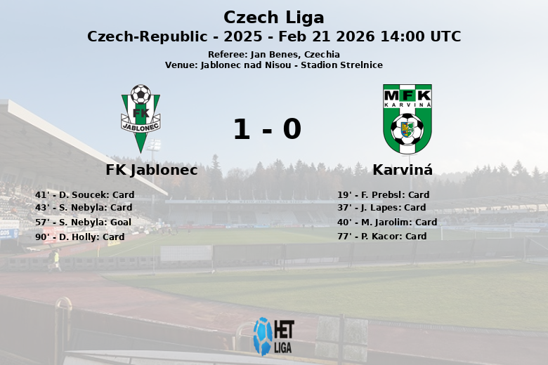 Le seul but du match est intervenu à la 57e minute, œuvre de S. Nebyla, donnant l’avantage au FK Jablonec. Malgré les tentatives de Karviná pour égaliser, la défense de Jablonec est restée ferme. Le match s’est caractérisé par un jeu disputé au milieu de terrain et de nombreuses fautes, ce qui a entraîné un total de six cartons jaunes : trois pour chaque équipe. Le FK Jablonec a eu 8 corners contre 8 pour Karvina. Le match s’est terminé avec le FK Jablonec remportant les trois points dans une rencontre tendue et disputée.