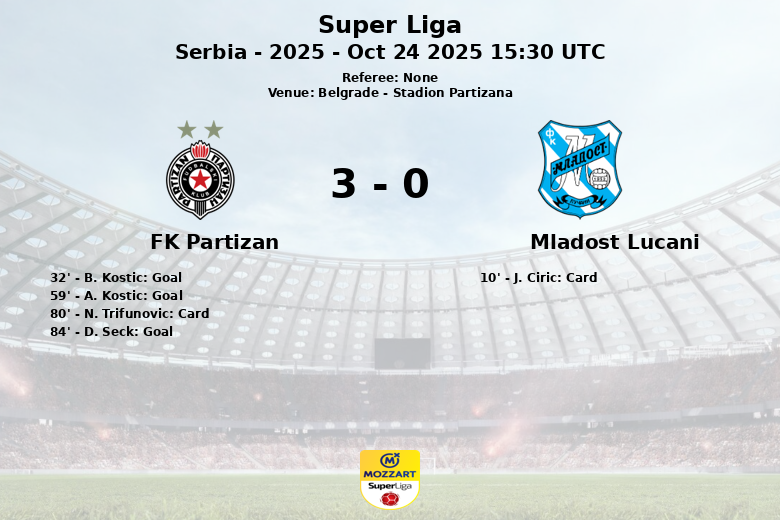 Le score a été ouvert à la 32e minute avec un but de B. Kostic, sur une passe décisive de M. Vukotic, donnant l’avantage au Partizan. En seconde période, A. Kostic a creusé l’écart à la 59e minute, assisté par D. Seck. Malgré leurs efforts, le Mladost Lucani n’a réussi à générer que 10 tirs, dont seulement 2 ont trouvé le chemin des filets défendus par le gardien de but local. D. Seck a scellé la victoire pour le Partizan avec un but à la 84e minute, sur une passe décisive de B. Natcho, consolidant le score final de 3 à 0. Le match a également connu des moments de tension, avec un carton jaune pour J. Ciric du Mladost Lucani à la 10e minute et un autre pour N. Trifunovic du Partizan à la 80e minute. Malgré les fautes commises par les deux équipes (12 pour le Partizan et 5 pour le Mladost Lucani), le match s’est déroulé sans expulsion. Le Partizan confirme sa bonne forme en Super Liga, tandis que le Mladost Lucani devra analyser les erreurs commises pour s’améliorer lors des prochains matchs. Le score final était de 3 à 0.