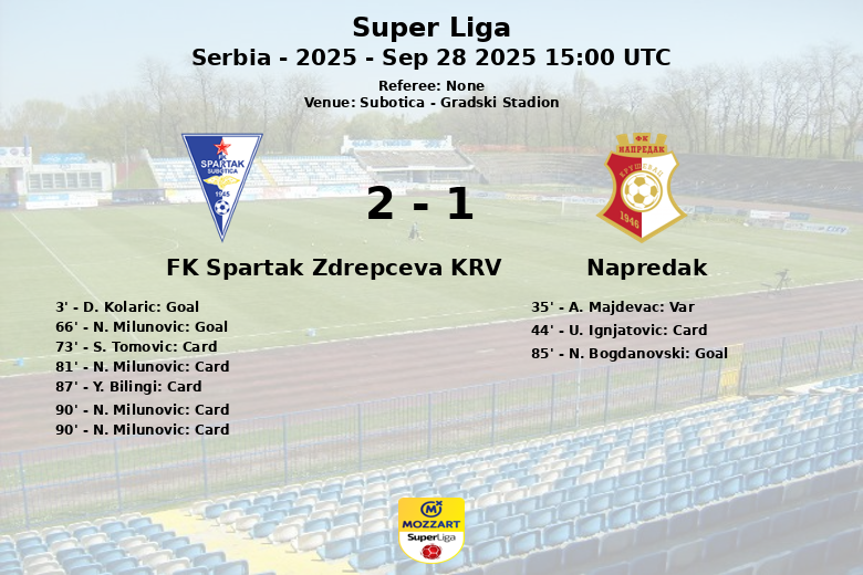Subotica, Serbie – Dans un match disputé au Gradski Stadion, le FK Spartak Zdrepceva KRV a battu Napredak sur le score de 2 à 1 lors de la dixième journée de la Super Liga serbe. La rencontre, pleine d’intensité et d’émotions, a été marquée par un nombre élevé de cartons et un but refusé par la VAR.