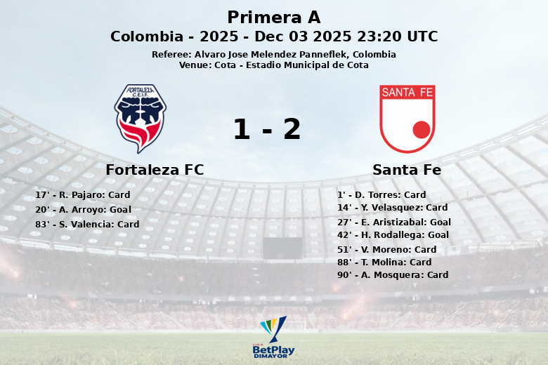 Dans un match chargé d’émotion et de cartons, Santa Fe a réussi à vaincre Fortaleza FC à l’Estadio Municipal de Cota, lors d’un match correspondant à la cinquième journée du Quadrangulaire de Clôture de la Primera A colombienne. Le match, arbitré par Álvaro José Meléndez Panneflek, a été caractérisé par son intensité et de nombreuses infractions.