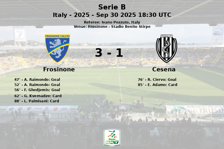 Cesena a réagi et réduit l’écart à la 76e minute grâce à un but de R. Ciervo, sur une passe de C. Shpendi, donnant espoir aux visiteurs. Malgré leurs efforts jusqu’à la fin, avec une possession de balle plus importante (57 % contre 43 % pour Frosinone) et un plus grand nombre de fautes commises (17 contre 13), Cesena n’a pas réussi à égaliser. Frosinone, avec 7 tirs cadrés, a su profiter de ses occasions, tandis que Cesena n’a réussi que 2 tirs précis. L’arbitre du match, Ivano Pezzuto, a distribué deux cartons jaunes (un pour chaque équipe) et un carton rouge pour Frosinone, dans un match qui s’est enflammé dans les dernières minutes.