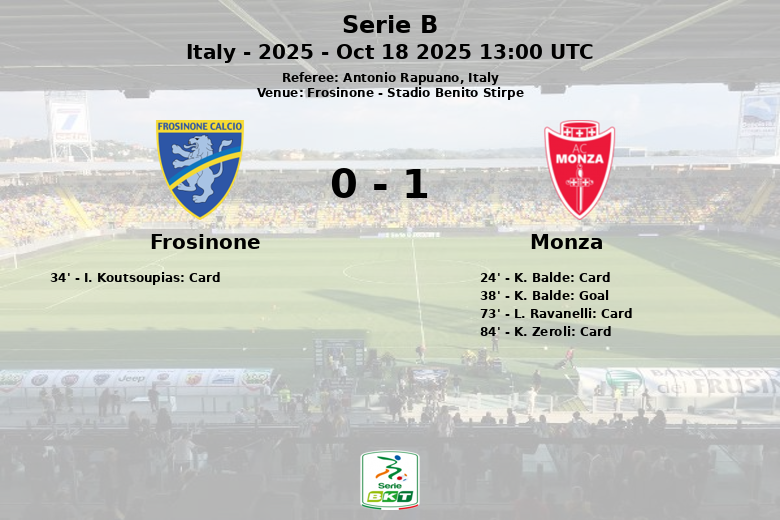 La première mi-temps a été marquée par l’intensité au milieu de terrain. K. Balde de Monza a reçu un carton jaune à la 24e minute, suivi par I. Koutsoupias de Frosinone à la 34e minute. Juste avant la mi-temps, à la 38e minute, K. Balde s’est racheté en marquant le seul but du match pour Monza, sans passe décisive apparente.