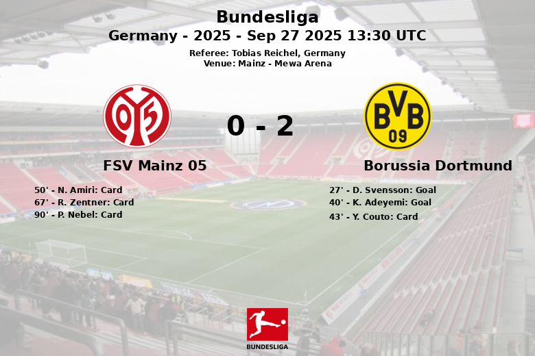 La deuxième mi-temps a été marquée par de nombreux cartons. Y. Couto de Dortmund a reçu un carton jaune à la 43e minute. La frustration de Mayence est devenue évidente avec un carton jaune pour N. Amiri à la 50e minute. Le moment le plus critique pour Mayence est arrivé à la 67e minute avec l’expulsion de son gardien de but, R. Zentner, laissant l’équipe dans une situation très difficile. Vers la fin du match, P. Nebel de Mayence a également été averti d’un carton jaune à la 90e minute.