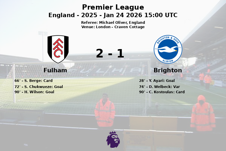 Alors qu’il semblait que Brighton allait remporter la victoire, H. Wilson a marqué le but égalisateur pour Fulham à la 90e minute, déclenchant l’euphorie dans les tribunes de Craven Cottage. Le match s’est terminé par un partage des points qui reflète l’égalité et la combativité dont ont fait preuve les deux équipes. Le match a également connu des moments de tension, comme en témoigne un carton jaune pour S. Berge de Fulham et un autre pour C. Kostoulas de Brighton.