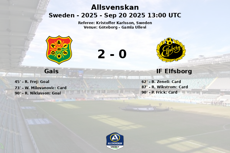 Le match est devenu tendu en seconde mi-temps, avec plusieurs avertissements et l’expulsion de R. Wikstrom d’IF Elfsborg à la 87e minute. Dans le temps additionnel, R. Niklasson a scellé la victoire avec un but à la 90e minute, sans passe décisive préalable, assurant ainsi les trois points pour GAIS.
