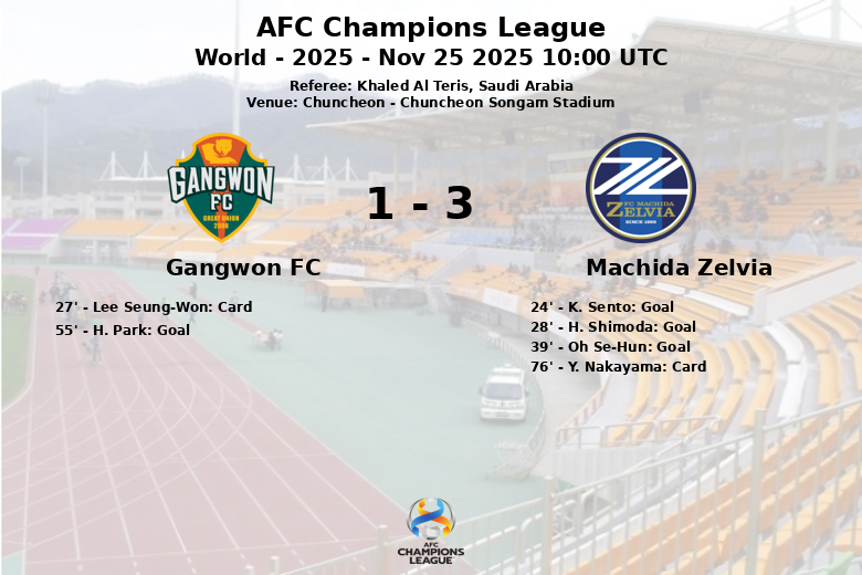 En seconde période, le Gangwon FC a tenté de réagir et a réussi à réduire l’écart à la 55e minute grâce à un but de H. Park, sur une passe décisive de Kim Dae-Won. Cependant, malgré sa domination territoriale et un total de 11 tirs, dont 4 cadrés, le Gangwon FC n’a pas pu inverser le résultat. Machida Zelvia, avec 9 tirs au total (3 cadrés), a su profiter de ses opportunités et défendre son avance jusqu’à la fin. Le match, arbitré par Khaled Al Teris d’Arabie saoudite, a été marqué par un nombre élevé de fautes de Machida Zelvia (14), qui a également reçu un carton jaune (Y. Nakayama). Le Gangwon FC a reçu un carton jaune (Lee Seung-Won).