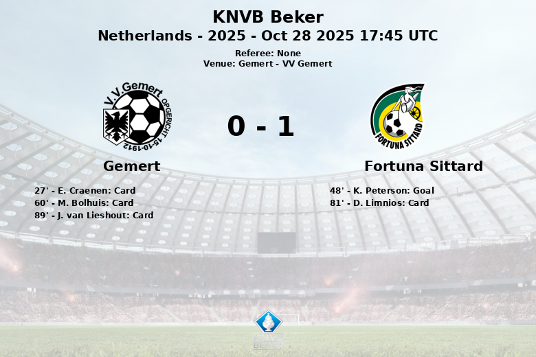 Bien que Gemert ait dépassé le Fortuna Sittard en nombre de tirs et de corners (10 contre 6), l’efficacité du Fortuna Sittard et son plus grand contrôle du ballon ont été déterminants pour assurer la victoire. Le match s’est terminé sur un score favorable au Fortuna Sittard, qui avance ainsi en KNVB Beker.