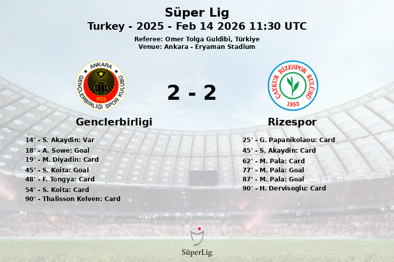 Un match vibrant s’est déroulé au stade Eryaman d’Ankara, où Genclerbirligi et Rizespor ont fait match nul dans une rencontre pleine de rebondissements. Genclerbirligi, avec 38% de possession, a ouvert le score grâce à un but contre son camp de A. Sowe à la 18e minute, suite à une action malheureuse. Auparavant, à la 14e minute, un but de S. Akaydin pour Genclerbirligi avait été refusé pour hors-jeu après l’intervention du VAR. L’équipe locale a creusé l’écart juste avant la mi-temps avec un but de S. Koita à la 45e minute, sur une passe décisive de F. Tongya.