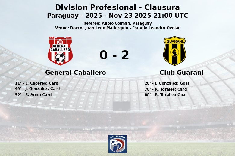 La seconde mi-temps s’est poursuivie sur un rythme similaire, marquée par de nombreuses fautes et avertissements. General Caballero a continué à essayer d’inverser la situation, accumulant sept corners en sa faveur, mais sans pouvoir concrétiser. Finalement, à la 88e minute, R. Torales a scellé le match avec un but pour le Club Guaraní, consolidant la victoire de son équipe. L’arbitre, Alipio Colman, a officié le match.