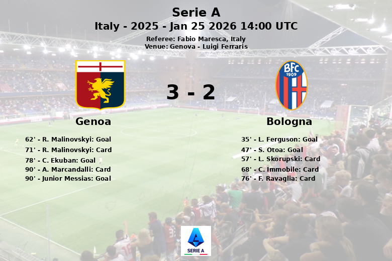 Cependant, le Genoa n’a pas abandonné et a commencé son assaut sur le but adverse. R. Malinovskyi a réduit le score à la 62e minute, lançant la remontée épique. L’expulsion de L. Skorupski à la 57e minute a encore compliqué les choses pour Bologne, qui a été contraint de jouer à dix pendant une grande partie de la seconde mi-temps. Le Genoa a profité de la supériorité numérique et C. Ekuban a égalisé à la 78e minute. Dans le temps additionnel, Junior Messias a scellé la victoire pour le Genoa avec un but à la 90e minute.
