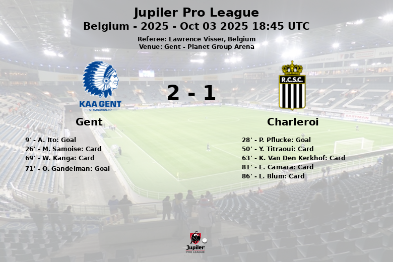Gent, Belgique – Lors d’un match comptant pour la dixième journée de la Jupiler Pro League, Gent a remporté une victoire sur Charleroi au Planet Group Arena. Le match, arbitré par Lawrence Visser, a été un duel tactique avec des moments de tension et de beau jeu.