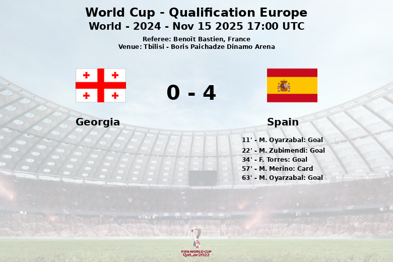 Tbilissi, Géorgie – L’équipe nationale espagnole a démontré sa supériorité au Boris Paichadze Dinamo Arena en battant de manière convaincante la Géorgie lors d’un match comptant pour les qualifications européennes pour la Coupe du Monde. Le match, disputé sous l’œil attentif de l’arbitre français Benoît Bastien, s’est soldé par une victoire nette des visiteurs.