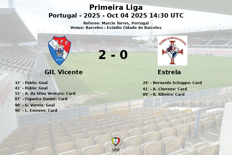 Dans le temps additionnel, Gil Vicente a eu l’occasion d’aggraver son avance avec un penalty, mais le tir de G. Varela a été raté, mais Varela a réussi à marquer sur le rebond. Néanmoins, l’équipe locale a pris les trois points dans un match qui a démontré sa solidité et sa capacité à répondre à la pression d’Estrela.