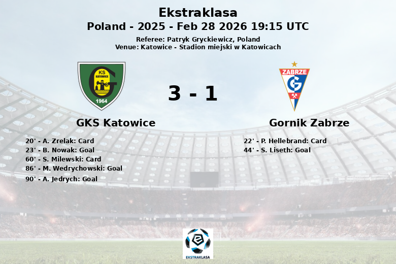 Katowice, Pologne – Dans un match vibrant et plein d’action disputé au Stadion miejski w Katowicach, le GKS Katowice a battu le Gornik Zabrze avec un score final de 3 à 1. Le match, valable pour la 23e journée de l’Ekstraklasa, saison 2025, était arbitré par Patryk Gryckiewicz.