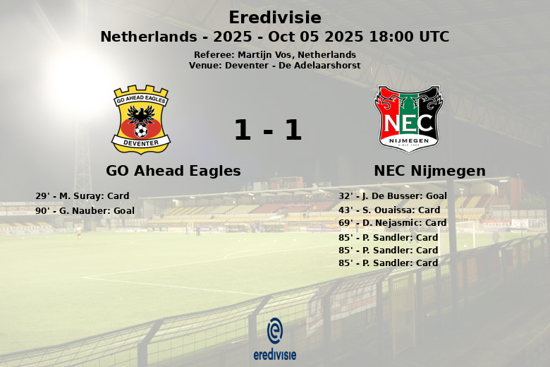 En ce qui concerne les statistiques globales, NEC Nijmegen a été plus agressif en attaque avec 17 tirs au total (7 cadrés et 5 non cadrés) contre 8 pour GO Ahead Eagles (3 cadrés et 3 non cadrés). Néanmoins, l’efficacité du GO Ahead Eagles et l’expulsion de Sandler se sont avérées décisives. Le match, arbitré par Martijn Vos, s’est soldé par 11 corners pour GO Ahead Eagles et 4 pour NEC Nijmegen, ainsi que 13 fautes commises par GO Ahead Eagles et 18 par NEC Nijmegen.