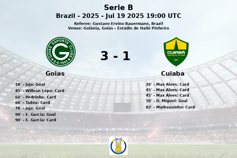 Goiás a dominé la possession avec 66 %, tandis que Cuiabá s’est contenté de 34 %. Le premier but du match est arrivé tôt, à la 18e minute, lorsque Jaja, aidé par Tadeu, a ouvert le score pour Goiás. Cuiabá a répondu à la 50e minute avec un but de D. Miguel, égalisant le score. Cependant, Jaja est réapparu à la 78e minute, cette fois aidé par Titi, pour redonner l’avantage à Goiás. Dans le temps additionnel, E. Garcia a scellé la victoire de l’équipe locale à la 90e minute.