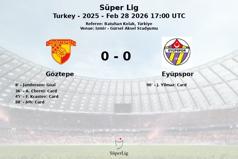 Remplacements dans l’quipe de göztepe: À la 46e minute, F. Krastev est entré et A. Dennis est sorti., À la 68e minute, A. Antunes est entré et Jeh est sorti., À la 76e minute, A. Cherni est entré et M. Mohammed est sorti., À la 85e minute, A. Kurtulan est entré et O. Bayrak est sorti., À la 85e minute, Janderson est entré et E. Bekiroglu est sorti.