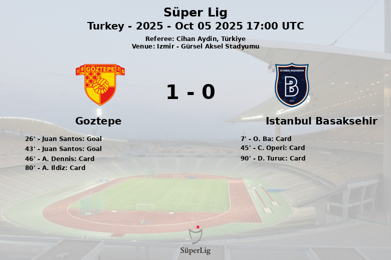Le match a commencé avec un carton jaune pour O. Ba d’İstanbul Başakşehir à la 7ème minute. À la 26ème minute, Juan Santos de Göztepe a raté un penalty, mais a racheté son erreur en marquant juste avant la mi-temps, à la 43ème minute, grâce à une passe décisive d’Allan Godoi.