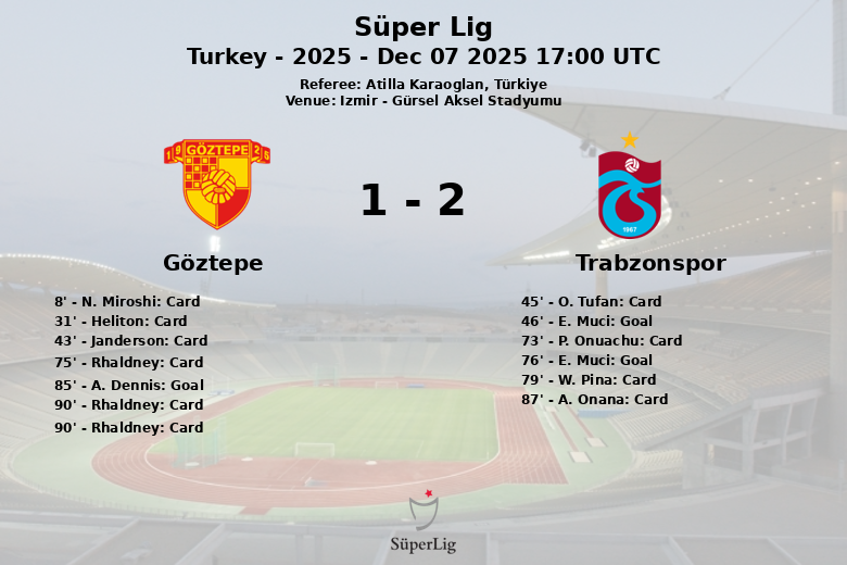 Le premier but du match est intervenu au début de la seconde mi-temps, à la 46e minute, avec un but de E. Muci pour Trabzonspor. Muci a marqué à nouveau à la 76e minute, augmentant l’avance de son équipe. Cependant, Göztepe n’a pas abandonné, et A. Dennis a réduit le score à la 85e minute, donnant de l’espoir aux supporters locaux.
