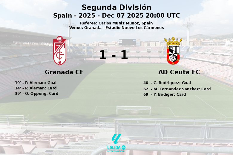 Grenade a ouvert le score à la 19e minute grâce à un but de P. Aleman, sur une passe de S. Faye. Cependant, leur joie a été de courte durée, car C. Rodriguez a égalisé pour Ceuta à la 40e minute.