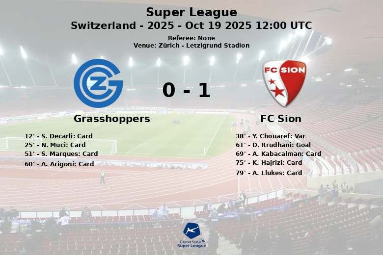 Malgré 13 tirs, un seul a trouvé le but adverse. Le FC Sion, avec plus de possession (57%), a profité de sa supériorité numérique. Un but refusé pour hors-jeu à la 38e minute n’a pas diminué sa détermination, et finalement D. Rrudhani a transformé un penalty à la 61e minute, donnant la victoire à son équipe. Le match a également été ponctué de cartons jaunes, trois pour Grasshoppers et deux pour le FC Sion, reflétant l’intensité de la rencontre. Le FC Sion a cumulé un total de 14 tirs dont 4 cadrés. Le match, correspondant à la neuvième journée de la Super League suisse, a laissé un goût amer aux supporters locaux. Le score final était Grasshoppers 0 – FC Sion 1.