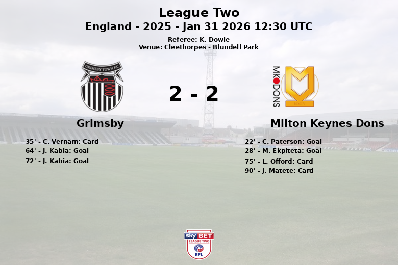 Milton Keynes Dons a pris l’avantage avec un but de C. Paterson sur penalty à la 22e minute, suivi d’un but de M. Ekpiteta à la 28e minute, semblant prendre le contrôle du match. Cependant, Grimsby a fait preuve de résilience.