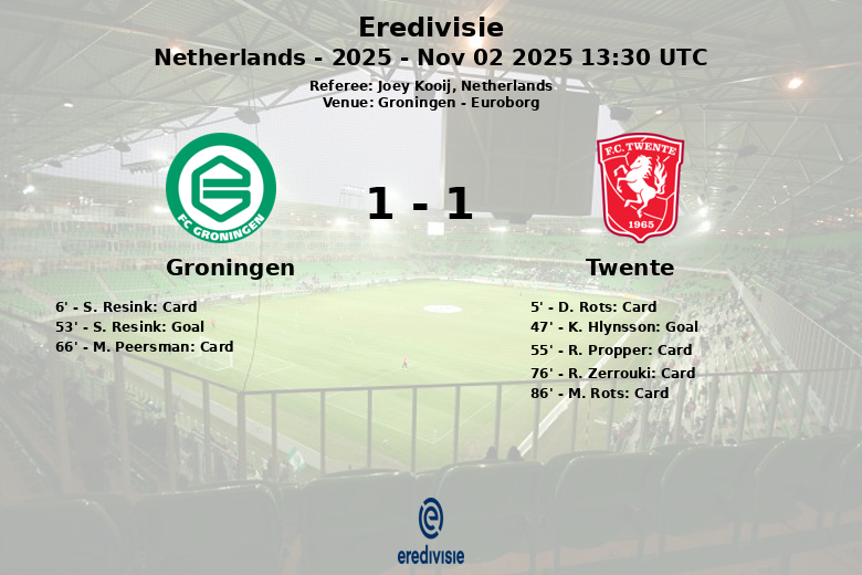Le match a commencé à un rythme effréné, reflété par les cartons jaunes précoces pour D. Rots de Twente à la 5e minute et S. Resink de Groningen à la 6e minute. Twente a pris l’avantage à la 47e minute grâce à un but de K. Hlynsson, servi par M. Rots. Cependant, la joie a été de courte durée car Groningen a égalisé à la 53e minute grâce à un penalty transformé par S. Resink.