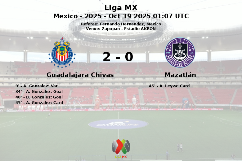 Zapopan, Mexique – Dans un match disputé à l’Estadio AKRON, Guadalajara Chivas a vaincu Mazatlán avec conviction, affichant une performance dominante et efficace. Malgré une controverse initiale avec un but refusé à A. Gonzalez à la 9e minute en raison d’une main après examen de la VAR, Chivas est resté imperturbable. A. Gonzalez s’est racheté en marquant un penalty à la 34e minute, ouvrant la voie à la victoire. Par la suite, B. Gonzalez a étendu l’avance à la 40e minute avec un but après une bonne passe de R. Ledezma.