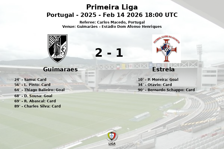 Thiago Balieiro a égalisé à la 64e minute avec un but, et D. Sousa a scellé la victoire pour l’équipe locale à la 68e minute, sur une passe décisive de J. I. Mendes. Le match a été marqué par l’intensité, avec un total de cinq cartons jaunes pour Guimarães et deux pour Estrela.