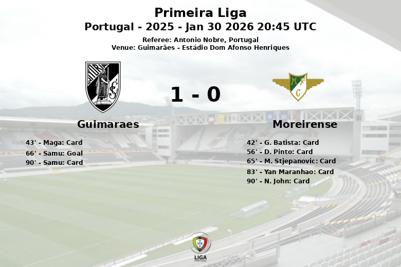 Guimarães, Portugal – Dans un match disputé à l’Estádio Dom Afonso Henriques, Guimarães a remporté une victoire étroite sur Moreirense dans un match rempli de tension et d’avertissements. La rencontre, comptant pour la 20e journée de la Primeira Liga de la saison 2025, s’est soldée par un score favorable à l’équipe locale.