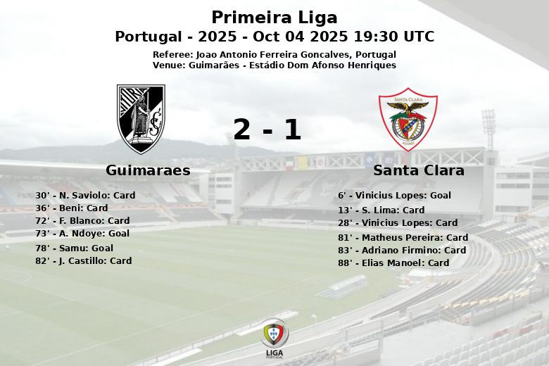 Guimarães, Portugal – Dans un match disputé à l’Estádio Dom Afonso Henriques, Guimarães a remporté une victoire importante contre Santa Clara dans un match rempli de tension et de cartons. Le match, comptant pour la huitième journée de la Primeira Liga 2025, a été marqué par un nombre élevé de fautes et d’avertissements, reflétant l’intensité avec laquelle les deux équipes ont joué.