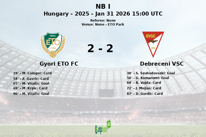 Le match disputé à l’ETO Park s’est terminé par un nul passionnant qui reflétait l’intensité du jeu. Bien que dominant la possession de balle avec 67%, Gyori ETO FC n’a pas réussi à traduire sa supériorité en buts. Debreceni VSC, plus efficace dans ses attaques, a pris l’avantage grâce à un but de Szuhodovszki à la 38e minute, sur une passe de Cibla. L’avance a été prolongée au début de la deuxième mi-temps avec un but de Komaromi. Cependant, Gyori ETO FC a réagi et Vitalis a marqué un penalty à la 65e minute. Le match est resté tendu et disputé, avec plusieurs cartons jaunes montrés aux deux équipes. Finalement, Vitalis a marqué un autre penalty dans la dernière minute du temps réglementaire, scellant le match nul final. Gyori ETO FC a montré une plus grande vocation offensive avec 13 tirs, dont 8 cadrés, tandis que Debreceni VSC, avec moins de possession, a réussi à être plus incisif dans ses attaques.
