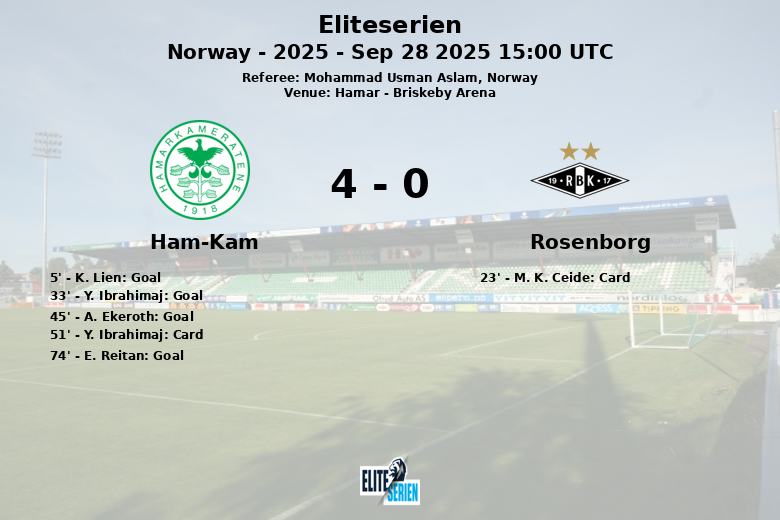 Rosenborg a subi un coup dur à la 23e minute avec l’expulsion de M. K. Ceide, laissant l’équipe à dix hommes pendant la majeure partie du match. Ham-Kam a profité de la supériorité numérique et a accru son avance avec des buts de Y. Ibrahimaj à la 33e minute et A. Ekeroth juste avant la mi-temps, à la 45e minute, ce dernier étant servi par K. Lien.