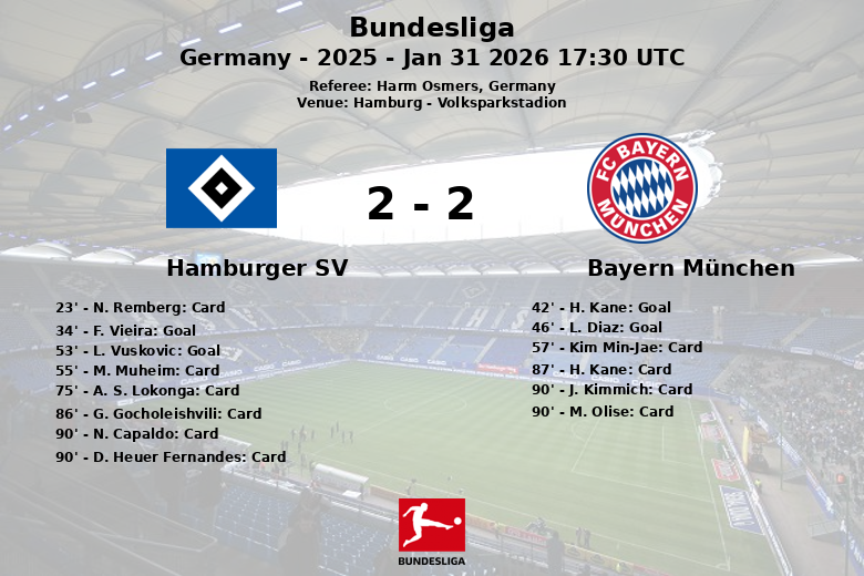 Le match a commencé à un rythme élevé, comme en témoigne le carton jaune adressé à N. Remberg à la 23e minute. Hambourg a pris l’avantage grâce à un penalty transformé par F. Vieira à la 34e minute. La joie locale fut de courte durée, car H. Kane a égalisé pour le Bayern à la 42e minute, sur une passe de J. Kimmich.
