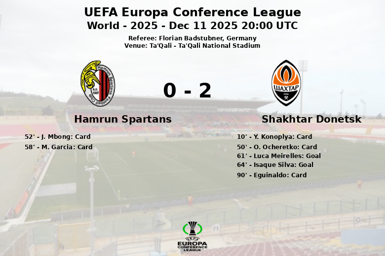 Ta’Qali, Malte – Le Shakhtar Donetsk a vaincu Hamrun Spartans lors d’un match de l’UEFA Europa Conference League qui s’est déroulé au Ta’Qali National Stadium. L’équipe ukrainienne a dominé la possession du ballon avec 61 % contre 39 % pour Hamrun Spartans. Malgré une première mi-temps sans but, le match s’est intensifié, comme en témoignent les cartons jaunes montrés à Y. Konoplya (10′) et O. Ocheretko (50′) pour le Shakhtar Donetsk, et à J. Mbong (52′) et M. Garcia (58′) pour Hamrun Spartans.