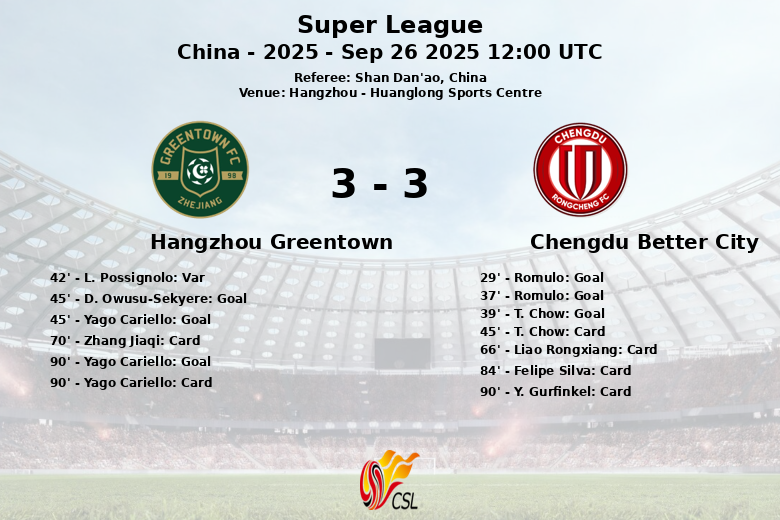 Chengdu Better City a pris l’avantage grâce à une attaque percutante en première mi-temps. Rómulo a ouvert le score à la 29e minute, sur une passe de T. Letschert, et a récidivé à la 37e minute, augmentant ainsi l’avance de son équipe. T. Chow a ajouté un troisième but à la 39e minute, également sur une passe de Letschert, laissant Hangzhou Greentown chancelant.