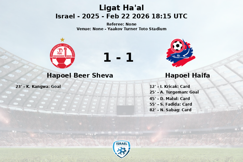 Le stade Yaakov Turner Toto a été le théâtre d’une rencontre palpitante entre Hapoel Beer Sheva et Hapoel Haifa, comptant pour la 24e journée de la Ligat Ha’Al. Le match, disputé le 22 février 2026, s’est soldé par un match nul qui a tenu les supporters en haleine.