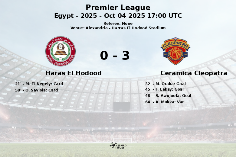 Alexandrie, Égypte – Dans un match disputé au Harras El Hodood Stadium, Ceramica Cleopatra a démontré sa supériorité en battant confortablement Haras El Hodood. La rencontre, comptant pour la 10e journée de la Premier League égyptienne, saison 2025, s’est soldée par une nette différence au tableau d’affichage.