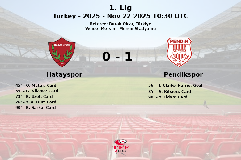 Le Mersin Stadyumu a été le théâtre d’un match acharné de la 1. Lig turque entre Hatayspor et Pendikspor, supervisé par l’arbitre Burak Olcar. Le match, correspondant à la 14e journée de la saison régulière 2025, s’est soldé par une victoire étroite de Pendikspor grâce à un but sur penalty.