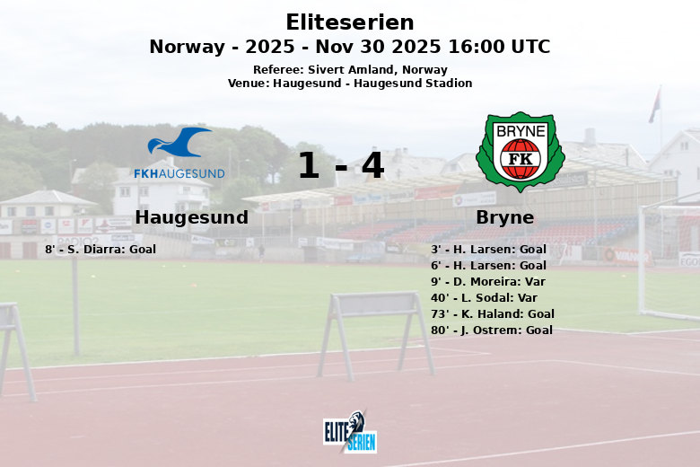 Haugesund, 30 novembre 2025 – Bryne a démontré sa puissance offensive au Haugesund Stadion, battant l’équipe locale dans un match passionnant d’Eliteserien. Un début explosif de Bryne les a rapidement mis en tête, avec H. Larsen marquant deux buts précoces à la 3e et à la 6e minute, sur des passes décisives de E. Saunes et S. Bojadzic respectivement. Haugesund a répondu avec un but de S. Diarra à la 8e minute, grâce à une passe de T. Nyhammer.