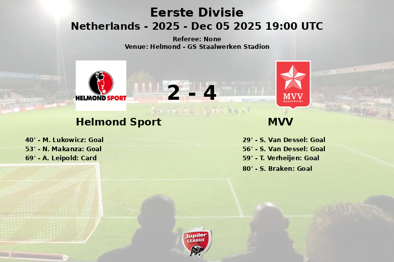 Le match a commencé sur un rythme effréné. S. Van Dessel a ouvert le score pour MVV à la 29e minute, sur une passe décisive de S. Braken. Cependant, Helmond Sport a réagi avant la mi-temps, avec M. Lukowicz trouvant le chemin des filets grâce à une passe de N. Makanza à la 40e minute.