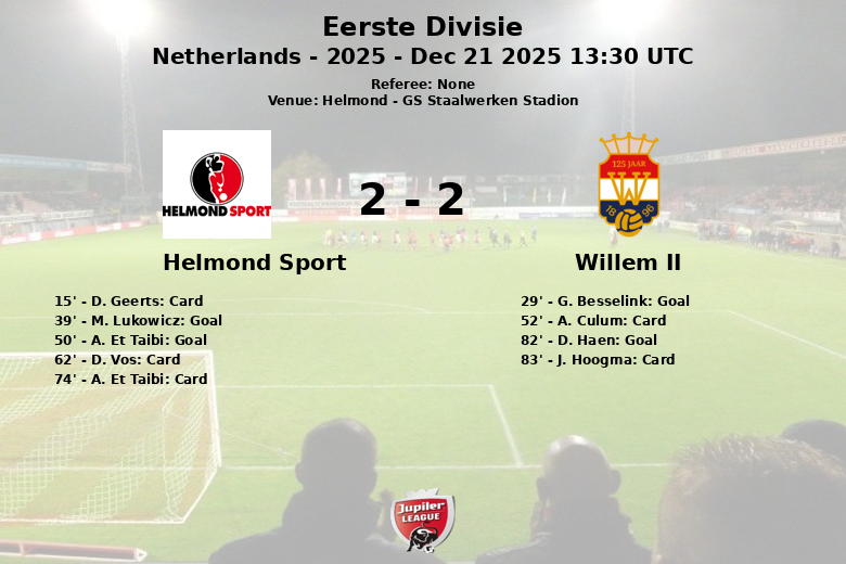 Le match a commencé intensément, avec le premier avertissement survenu rapidement, un carton jaune pour D. Geerts du Helmond Sport à la 15e minute. Cependant, c’est le Willem II qui a ouvert le score à la 29e minute grâce à un but de G. Besselink, sur une passe de A. Ciranni. La joie des visiteurs a été de courte durée, car M. Lukowicz du Helmond Sport a égalisé à la 39e minute grâce à une passe décisive de A. Et Taibi, menant le match à la mi-temps sur un score de 1-1.