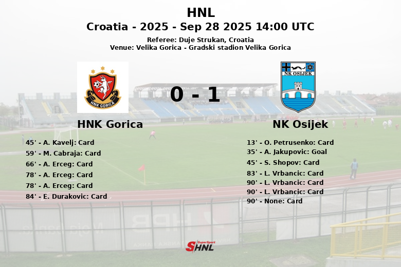 Remplacements dans l’quipe de hnk gorica: À la 34e minute, S. Peric est entré et L. Vrzic est sorti., À la 63e minute, F. Cuic est entré et A. Erceg est sorti., À la 63e minute, M. Cabraja est entré et E. Durakovic est sorti., À la 63e minute, O. Bakic est entré et I. Fiolic est sorti., À la 80e minute, A. Kavelj est entré et M. Gashi est sorti.