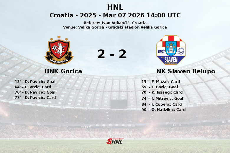 Velika Gorica, Croatie – Dans un match disputé au Gradski stadion Velika Gorica, HNK Gorica et NK Slaven Belupo ont fait match nul dans une rencontre pleine d’émotions et de rebondissements. HNK Gorica a pris l’avantage tôt, à la 13e minute, grâce à un but de D. Pavicic, sur une passe décisive de I. Pozo. Cependant, NK Slaven Belupo a réagi en seconde période. T. Bozic a égalisé à la 55e minute, sur une passe de L. Crepulja. J. Mitrovic a donné l’avantage à Slaven Belupo à la 74e minute, sur une passe de L. Zuta. Alors qu’il semblait que la victoire se dirigeait vers Koprivnica, D. Pavicic est réapparu pour Gorica à la 76e minute, marquant son deuxième but du match, sur une passe de B. Bogojevic, pour sceller le match nul final. Le match, arbitré par Ivan Vukančić, a été intense, avec un total de six cartons jaunes distribués. NK Slaven Belupo a dominé la possession avec 60 %, contre 40 % pour HNK Gorica. Slaven Belupo a également créé plus d’occasions de but, avec 11 tirs au total, mais seulement deux d’entre eux ont été cadrés. HNK Gorica, quant à lui, a réalisé 7 tirs, dont 3 cadrés. Le match s’inscrit dans le cadre de la 25e journée de la saison 2025 de la HNL.