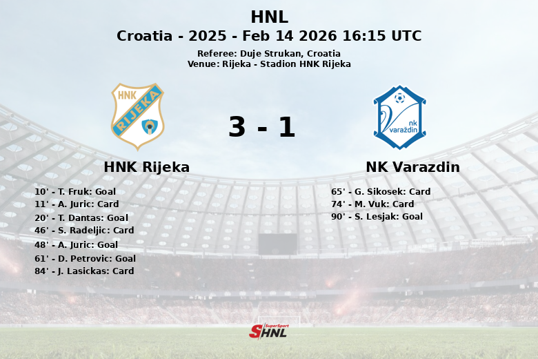 Rijeka a dominé la possession du ballon avec 54 % et a généré un total de 26 tirs, dont 9 cadrés. Varazdin, de son côté, a tenté de réagir avec 18 tirs, mais seulement 5 ont trouvé le cadre. L’arbitre Duje Strukan a averti plusieurs joueurs, distribuant trois cartons jaunes à Rijeka et deux à Varazdin. Le match, disputé le 14 février 2026, a reflété la supériorité de l’équipe locale, qui a remporté une victoire bien méritée devant ses supporters.