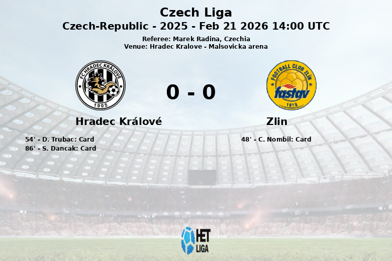 Hradec Králové, 21 février 2026 – Lors d’un match correspondant à la 23e journée de la Liga tchèque, Hradec Králové et Zlín ont fait match nul 0-0 à la Malsovicka arena de Hradec Kralove. Le match, arbitré par Marek Radina, a été caractérisé par une différence notable dans la possession du ballon, avec 65% en faveur de l’équipe locale.
