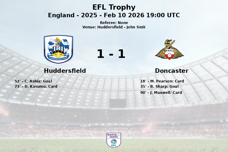 En seconde période, Huddersfield a réagi et C. Ashia a égalisé à la 52e minute grâce à un but suite à une passe décisive de B. Wales. Le match est resté intensément disputé, ce qui a conduit D. Kasumu de Huddersfield à recevoir un carton jaune à la 73e minute. Le match s’est envenimé avec l’avertissement de J. Maxwell de Doncaster dans le temps additionnel, à la 90e minute.